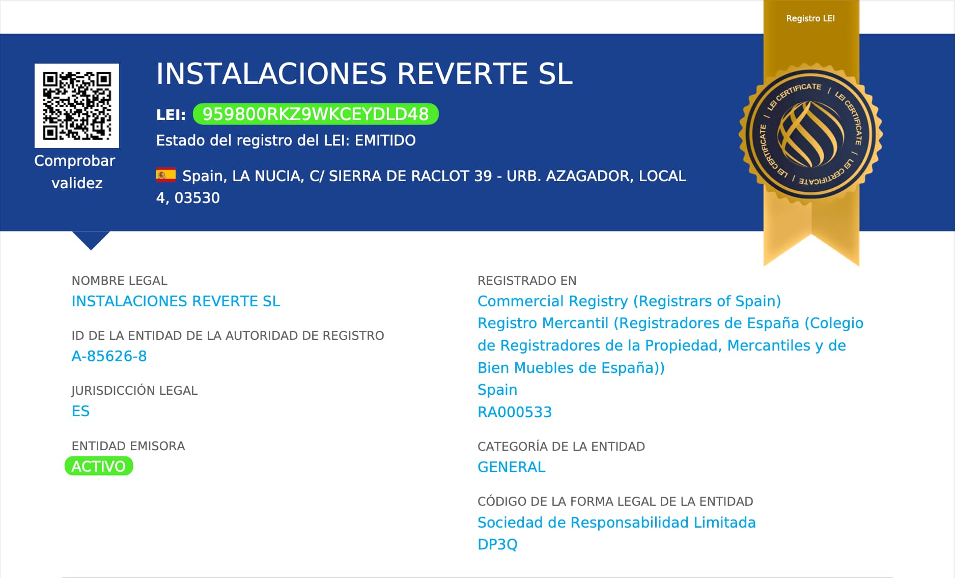 Empresa registrada en Industria. Certificado con el registro LEI: 959800RKZ9WKCEYDLD48.